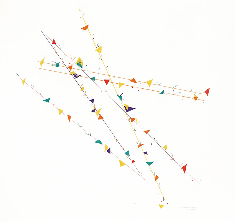 La structure même du papier blanc s’efface, la transparence et la fragilité du papier japonais devient le support d’une écriture toute faite de notes. Répondant à une ordonnance mathématique, les touches de couleurs frivoles se répandent et côtoient une multitude de petits motifs à la répétition dansante.