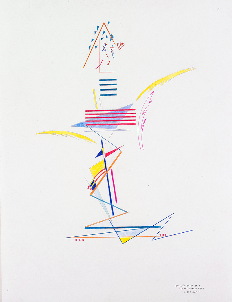Inspirées de sentiments, ces plumes aux allures et expressions bien humaines sont articulées par une composition faite de géométries et parcourue de pans colorés. La gamme chromatique acidulée est propre au travail d’Elisabeth, tandis que dans les séries “Passerelles” et “A la lumière du jour”, elle approfondit une couleur et la décline, entre Abstraction et Suprématisme, ici elle multiplie les rencontres colorées pour donner leur mouvement à ses personnages.