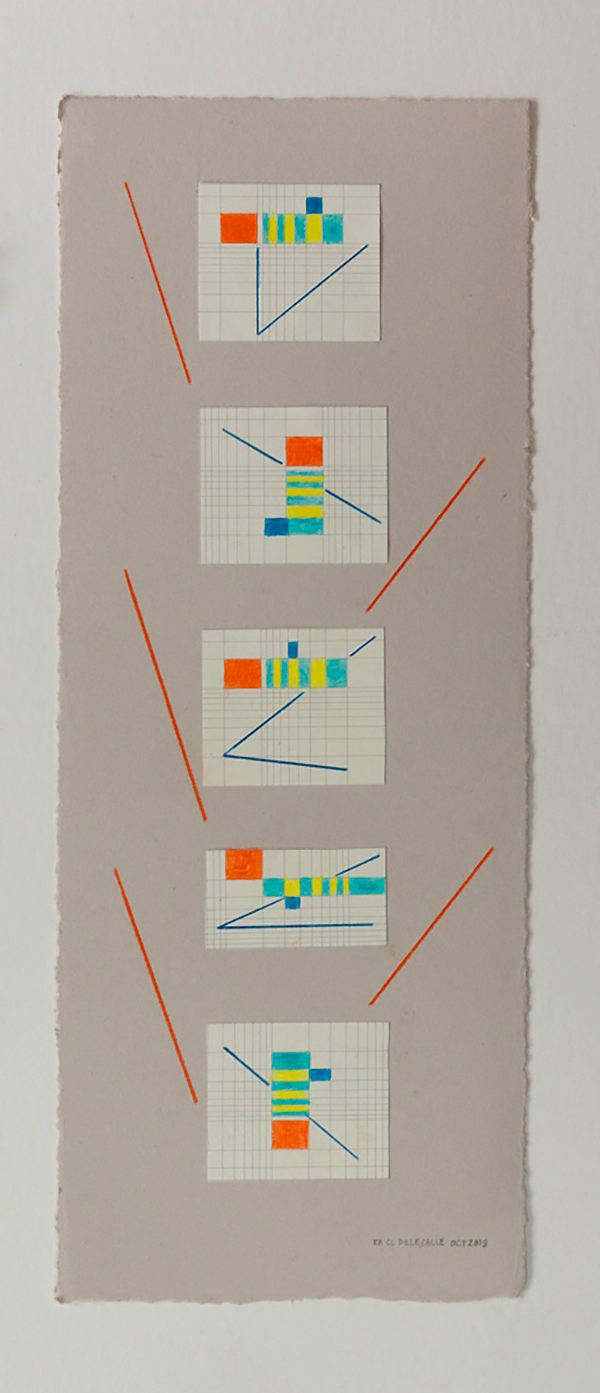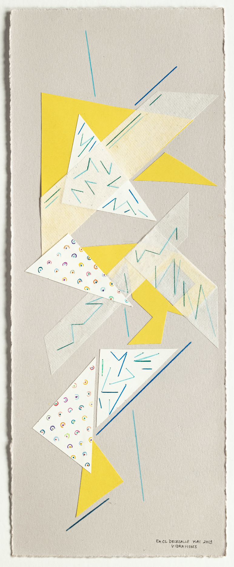 La série Vibrations réalisée en 2019, est un des travaux d’Elisabeth Delesalle qui réfère directement à la musique. Par l’utilisation d’un papier à carreaux, prenant allure de partitions où les notes s’inscrivent dans une abstraction en équilibre.
