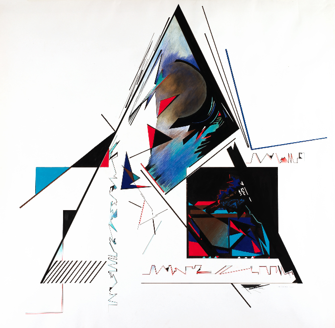 Cette oeuvre fait partie des grands formats réalisés par l’artiste. C’est un jeu de triangulation qui opère au coeur de l’espace du papier, ciselé, coloré et mis en mouvement par la minutie des tracés et ordonnance habile des tonalités chromatiques.